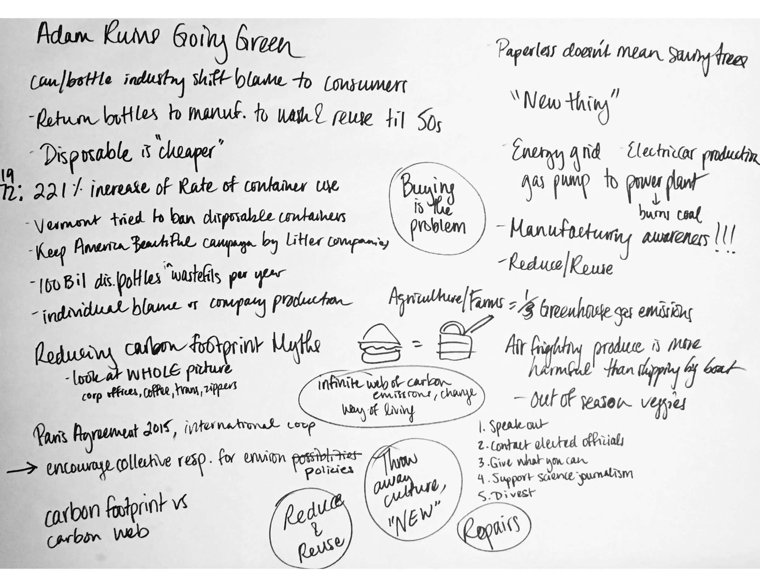 I grew curious about throw away culture and why there’s still so much waste despite recycling. To identify any misconceptions, I watched a show called Adam Ruins Everything. The host, Adam Conover & his reputable research team comically debunk common misconceptions with facts and cite their sources on their website. I took notes on Episode ‘Adam Ruins Going Green’ and merged those insights with the UN’s specific targets 12.5 and 12.8.