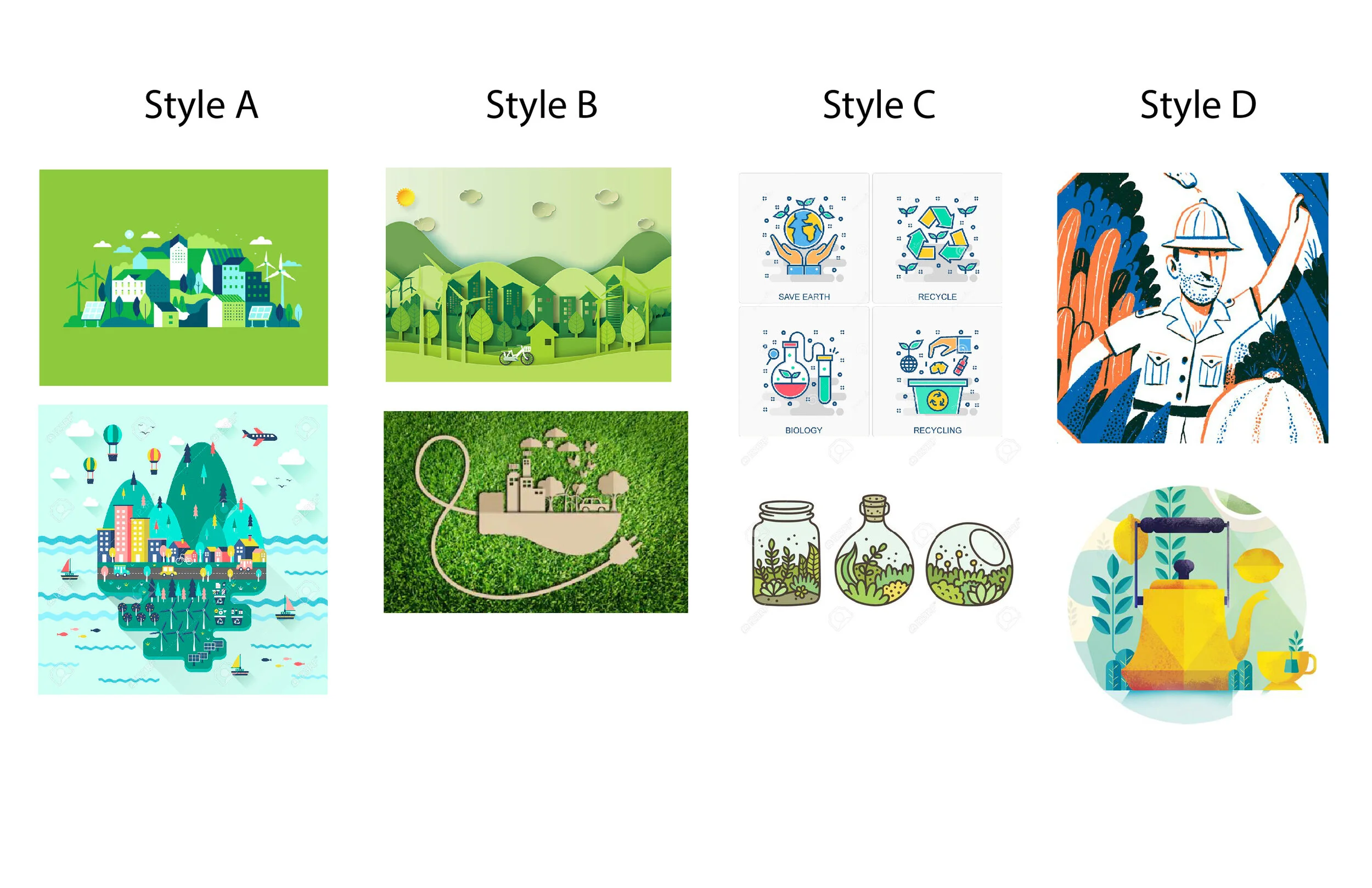 Considering the competition, I knew an illustrative approach would be the best type of solution for kids. I created a list of different illustration styles for students to vote on. Style A was a close second due to its color choices but Style B won for a variety of reasons. All students liked style B the best because of its 3D quality, shades, and paper-craft texture.