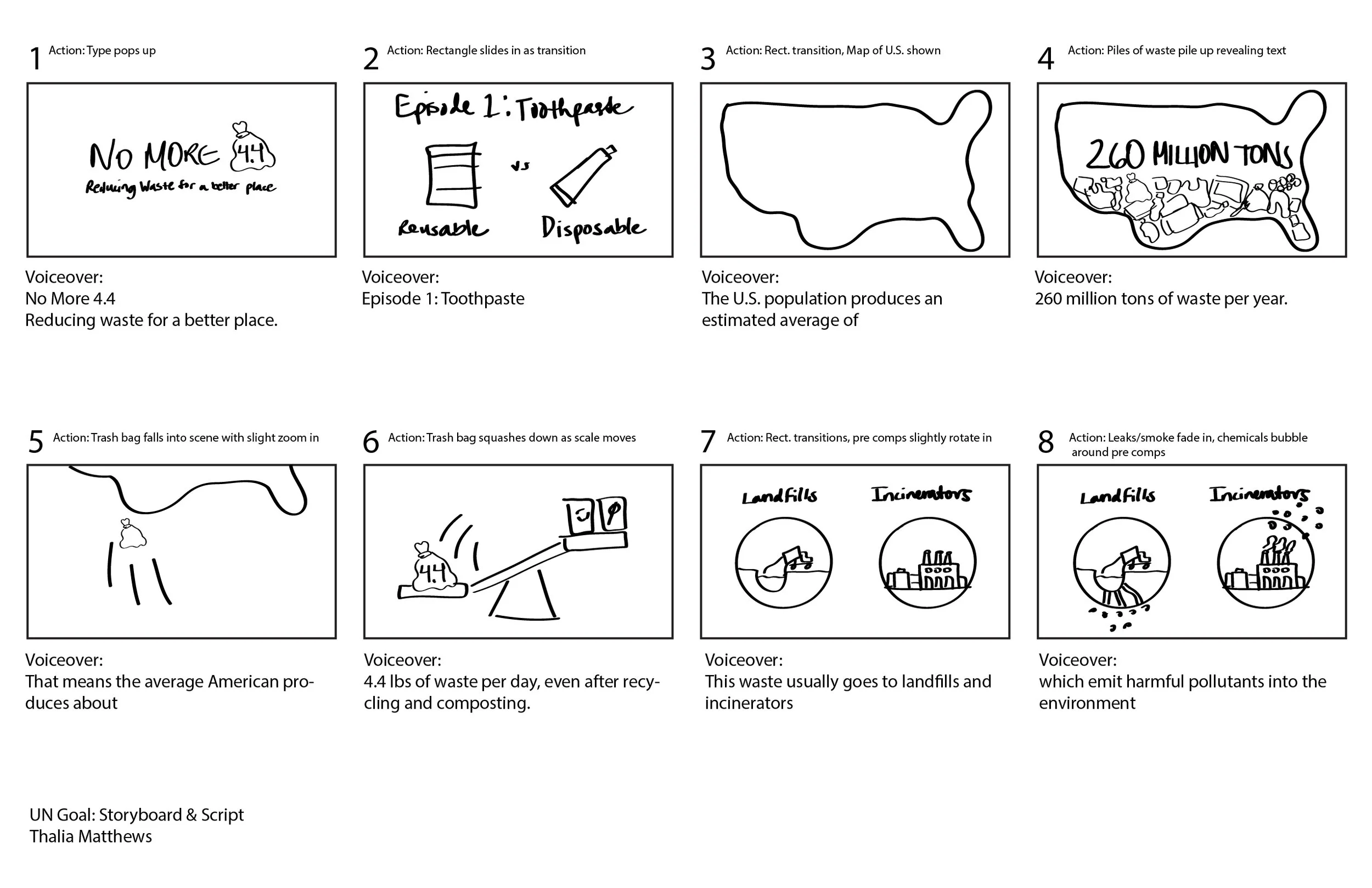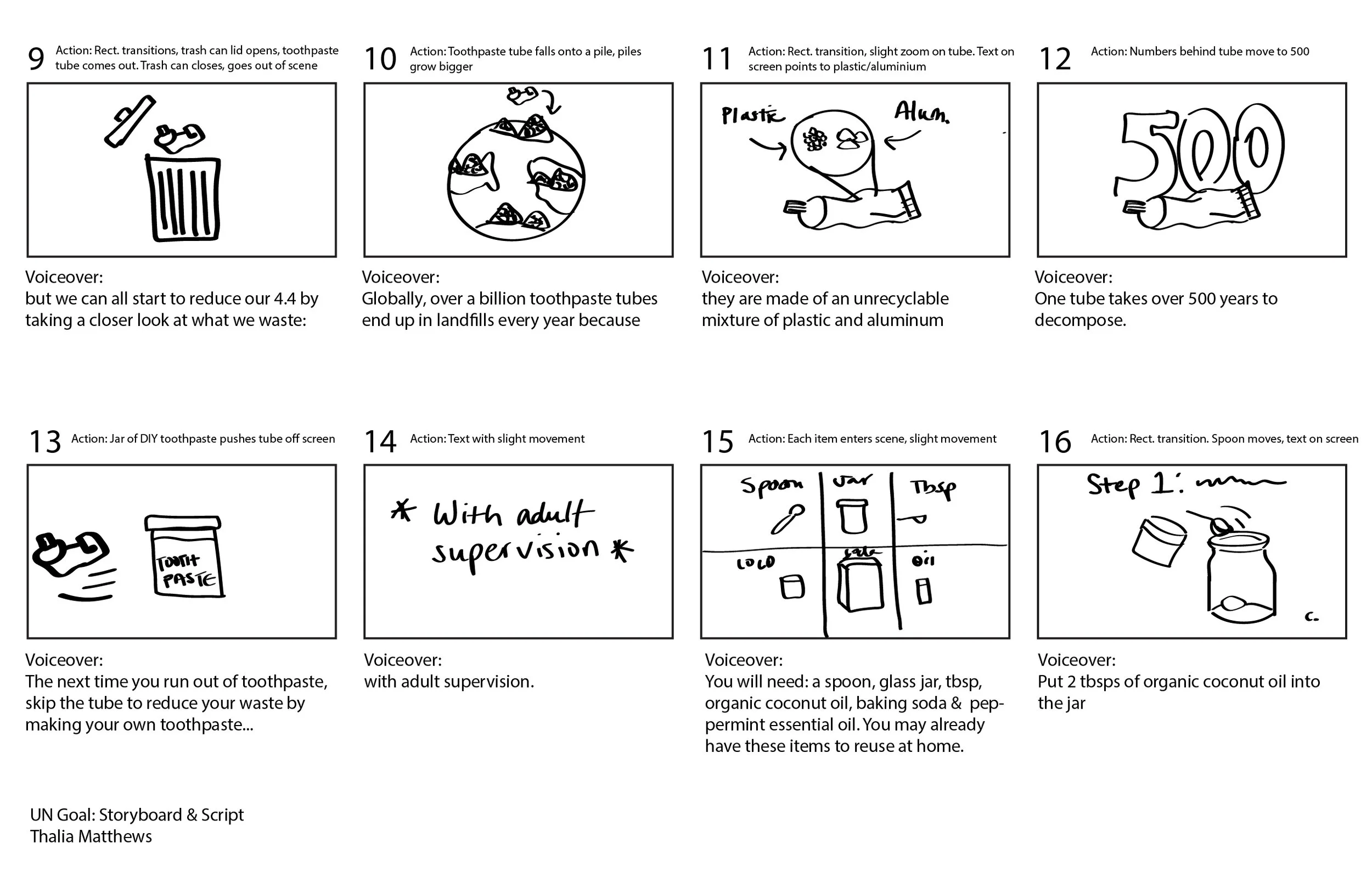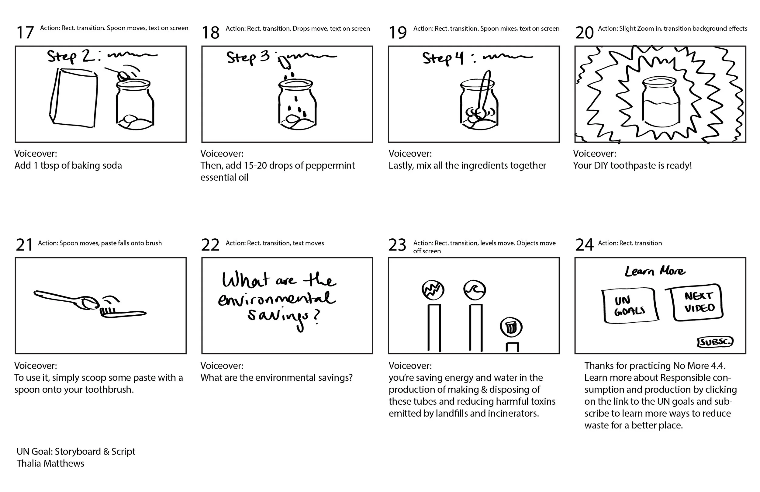 The user research led me to create a YouTube Channel called No More 4.4 which is designed specifically for kids to learn about low-waste living as a way to reduce waste while helping achieve UN Goal#12. Each animated episode features a DIY low-waste alternative versus buying a disposable item. Given time constraints, the final deliverable is Episode 1: Toothpaste.