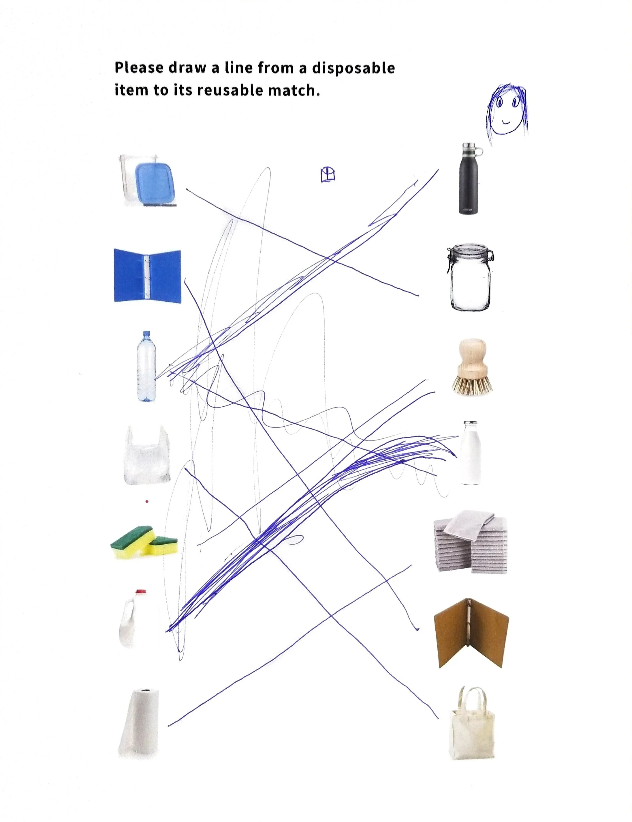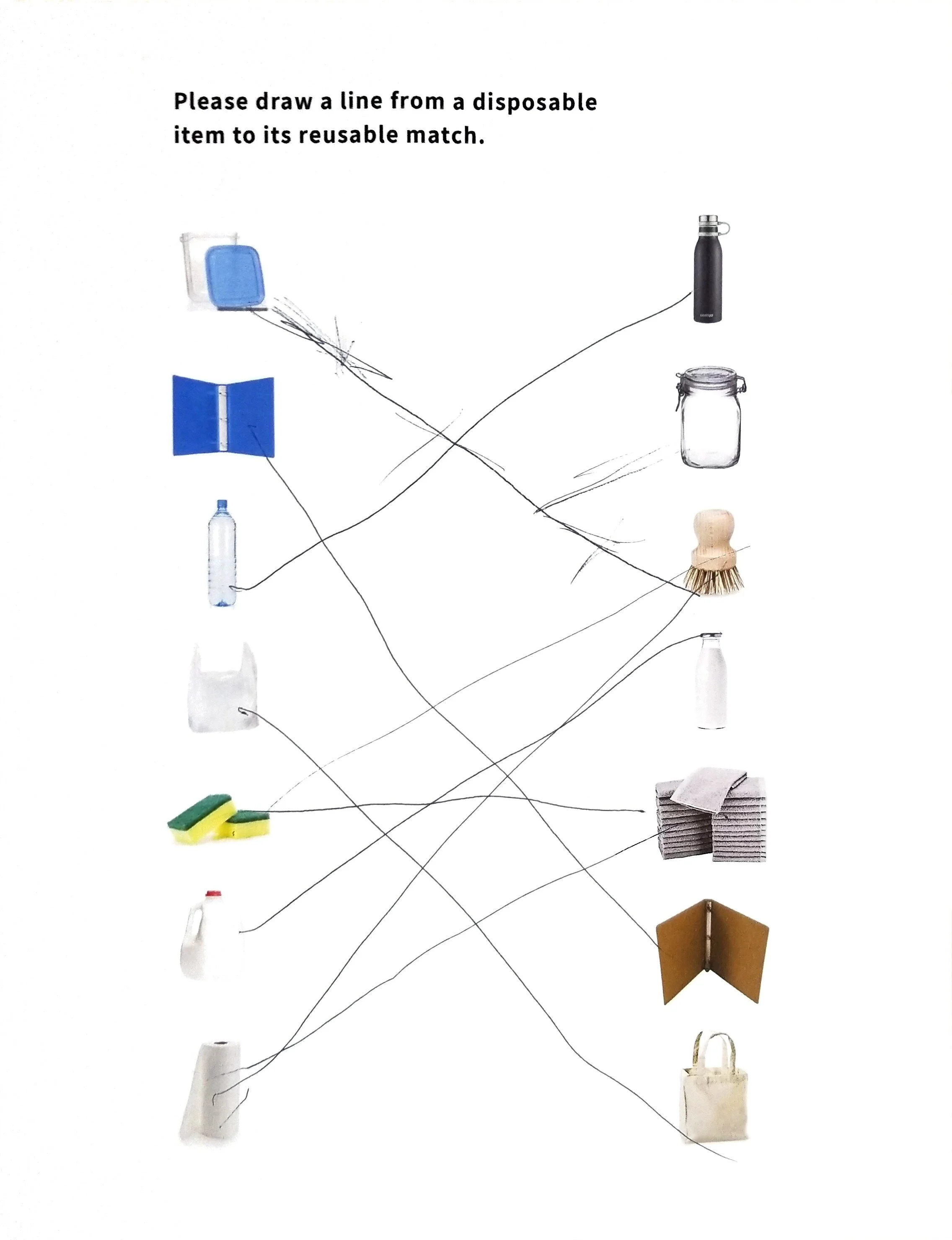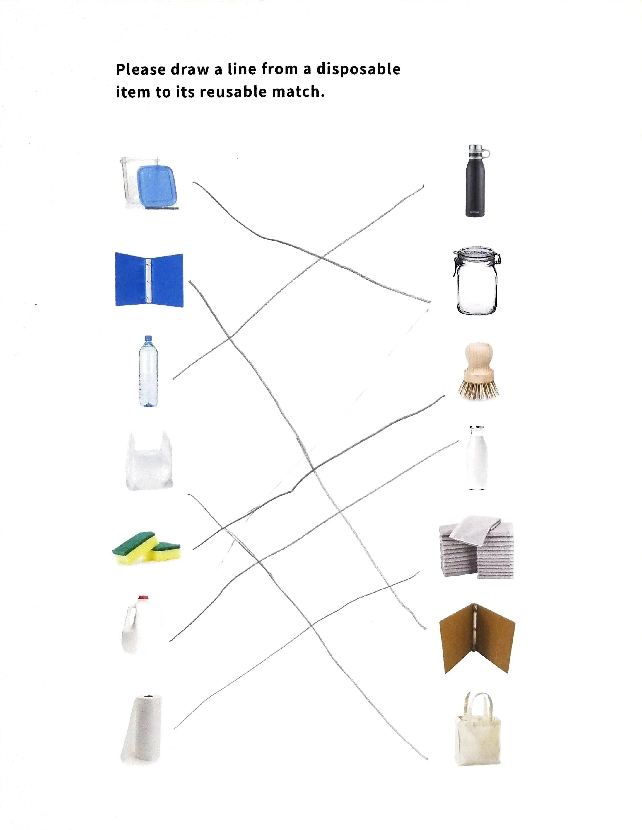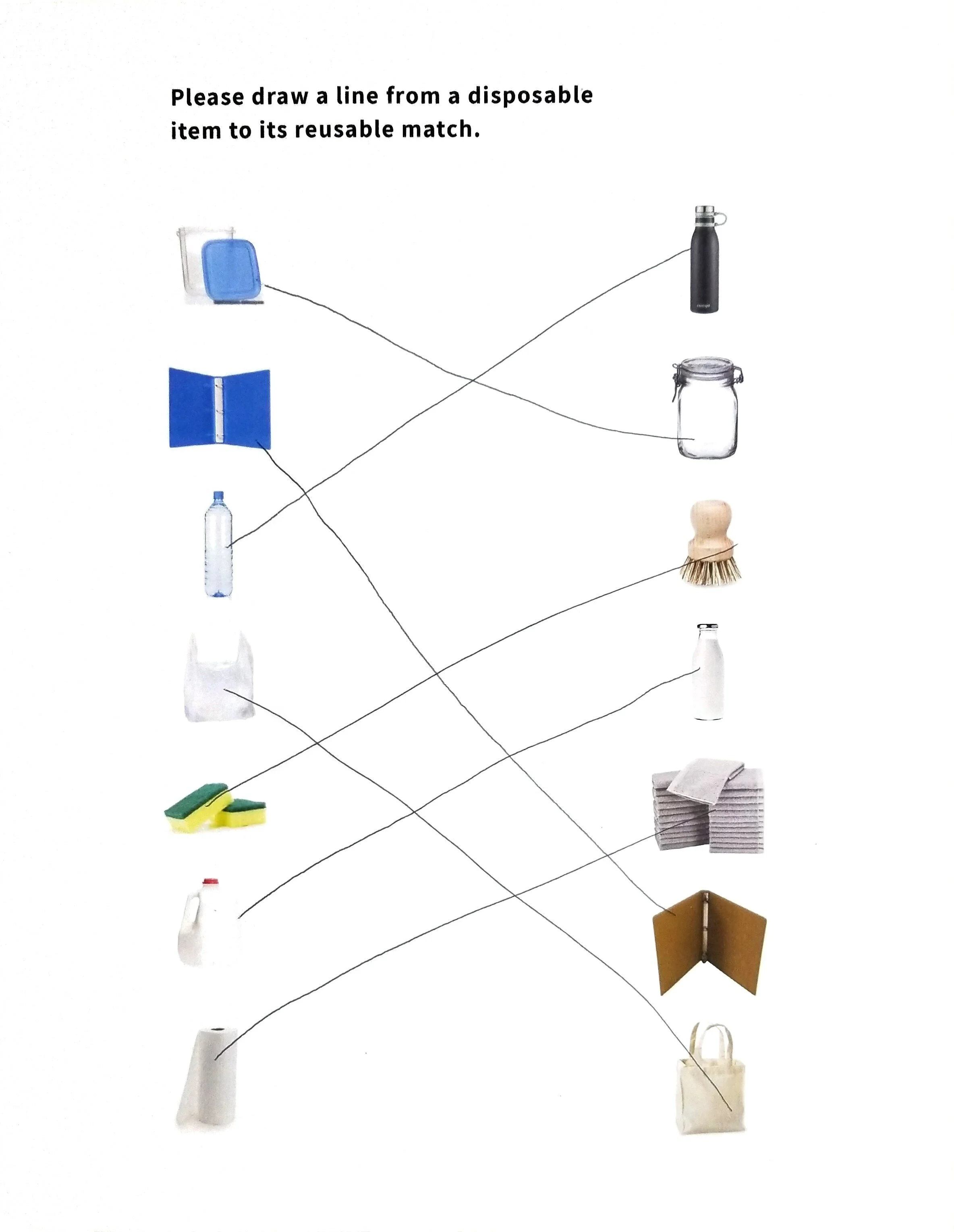 I created a worksheet to see if kids understood a key principle of consumption and production; differences between reusable & disposable items. Instructions read: Draw a line from a disposable item to its reusable match. The left column shows pictures of the most common disposable items. The right column shows pictures of their reusable alternatives.